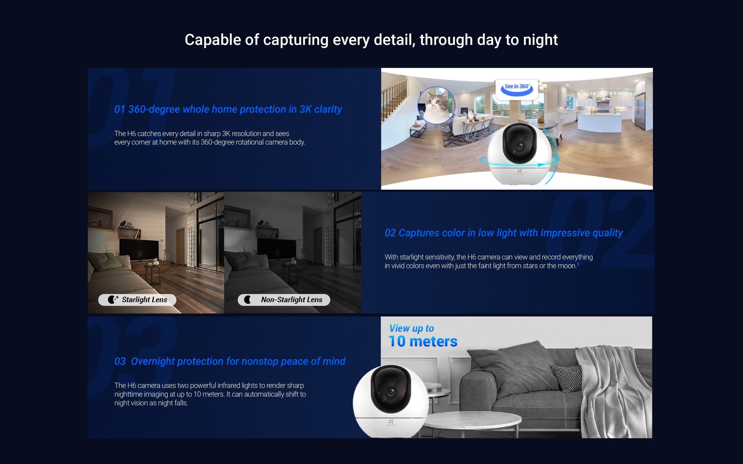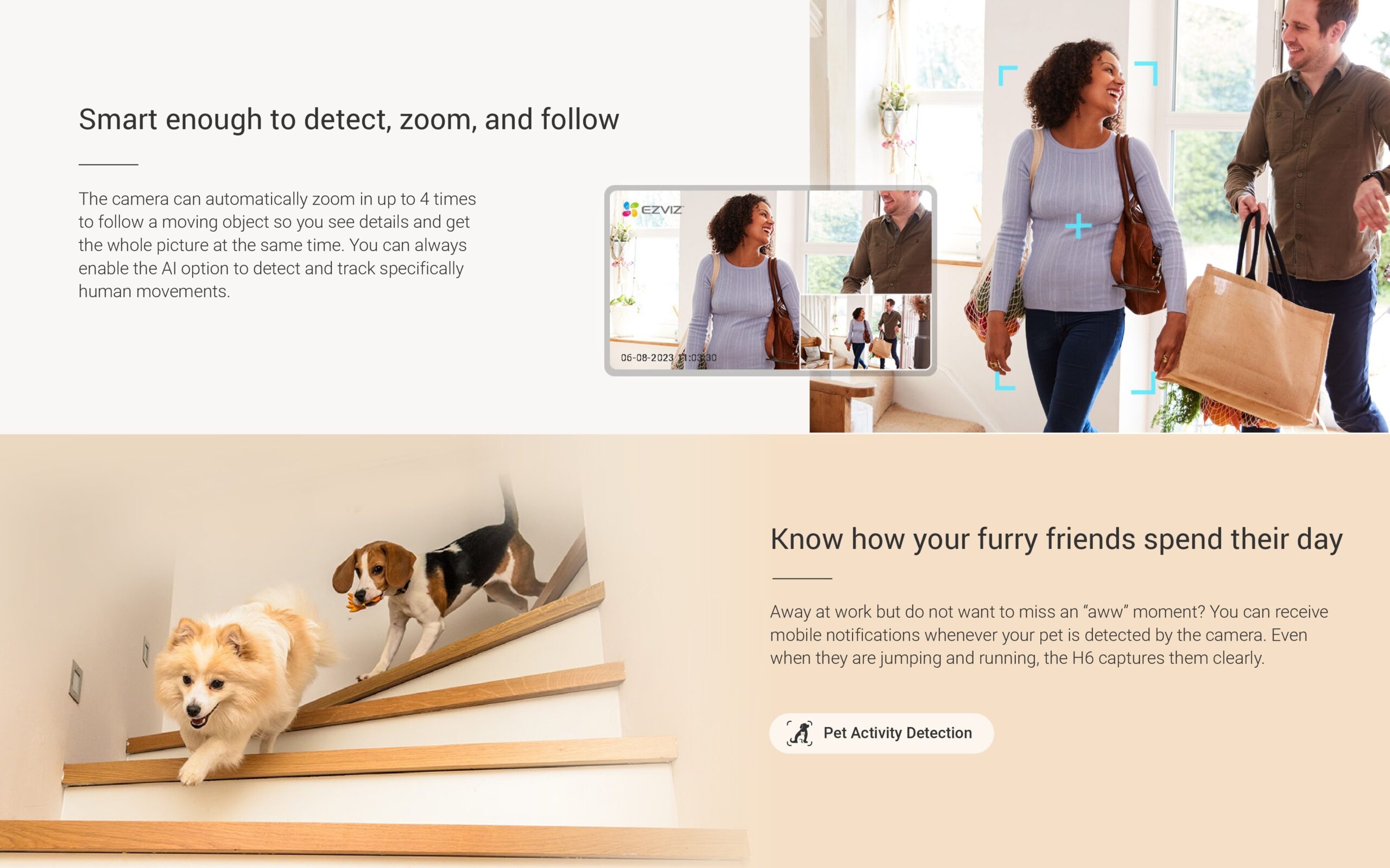 Experience reinforced home security and effortless connectivity with your loved ones. The EZVIZ H6 allows you to keep track of all the important moments at home and capture vivid details thanks to its impressive 3K resolution and color night vision, which is further improved by a starlight lens. As one of EZVIZ’s most feature-rich indoor cameras, the H6 is equipped with advanced on-camera AI that can detect voice activity, as well as the shapes of pets and humans.