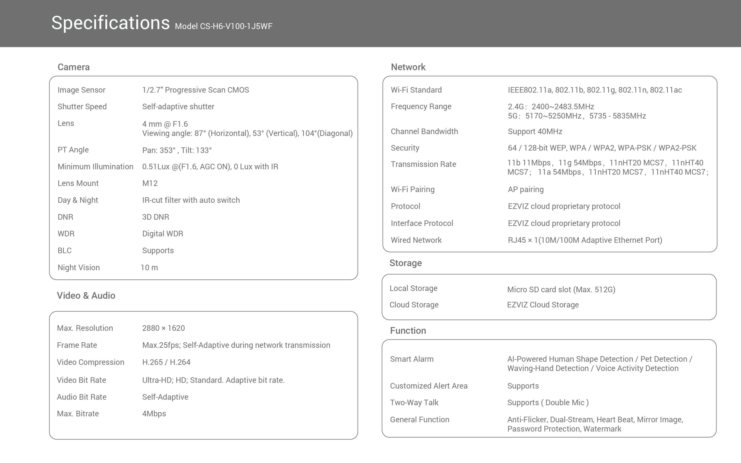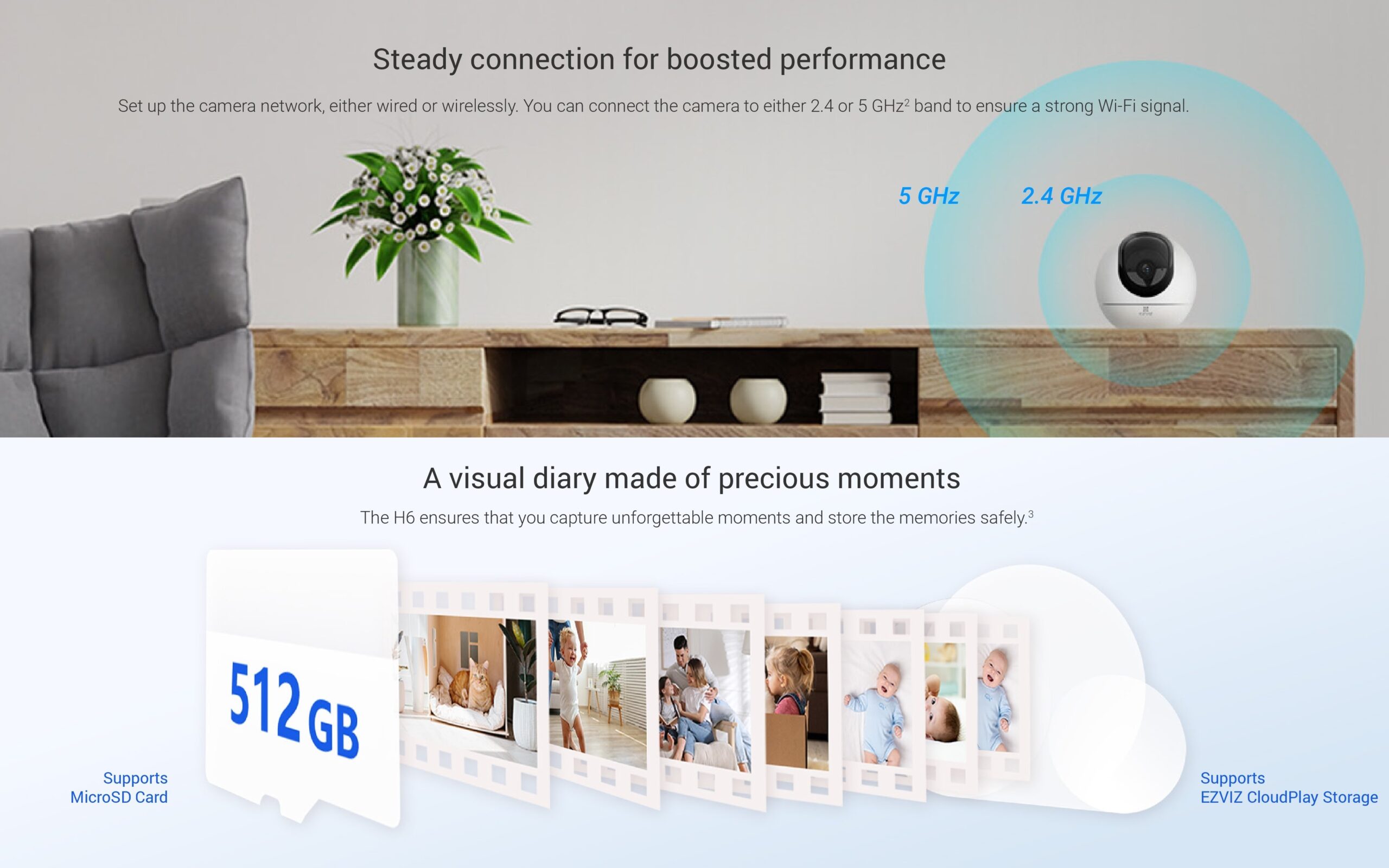 - Supports MicroSD Card (Up to 512 GB) & EZVIZ CloudPlay Storage
