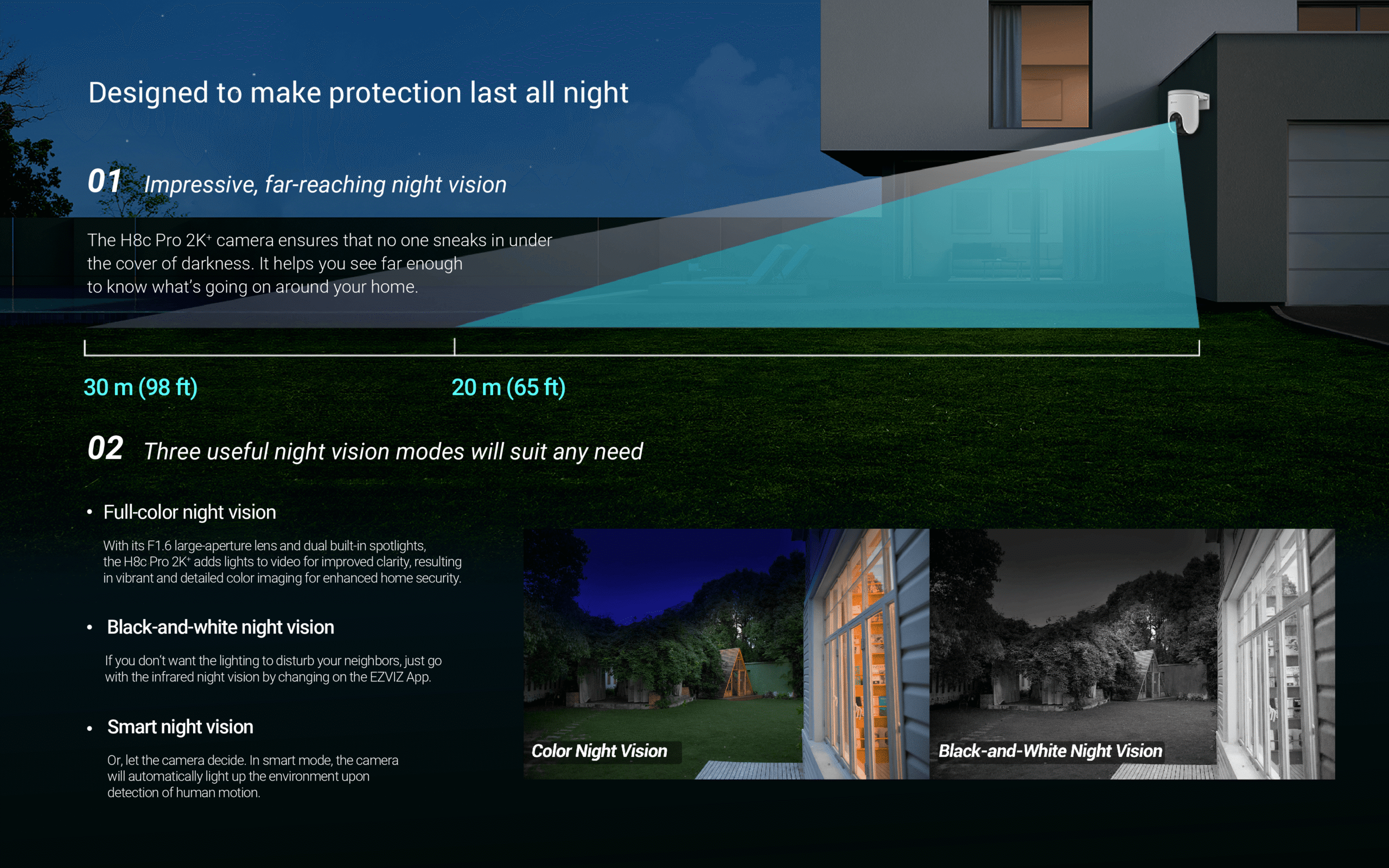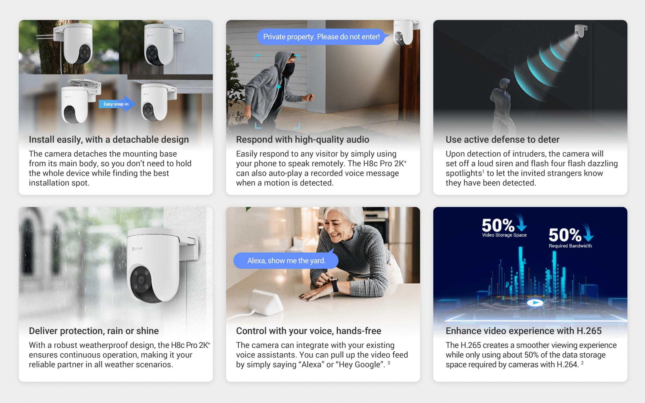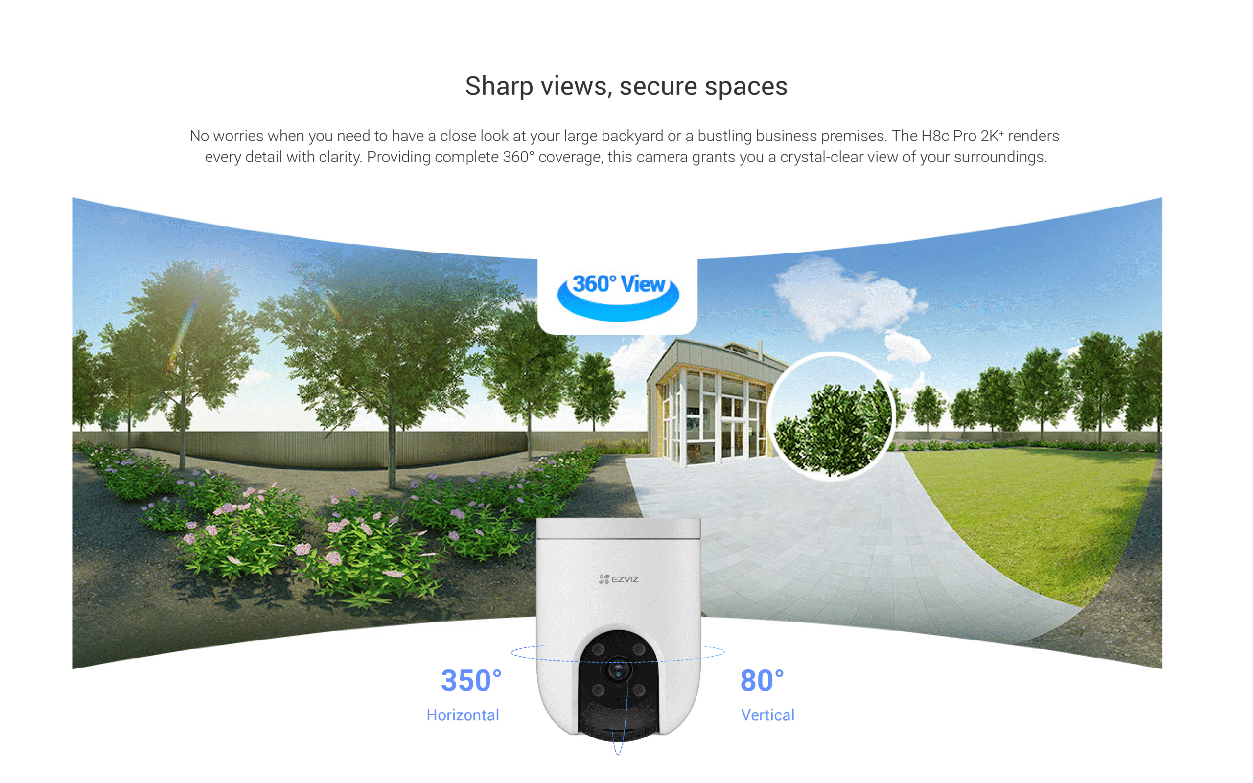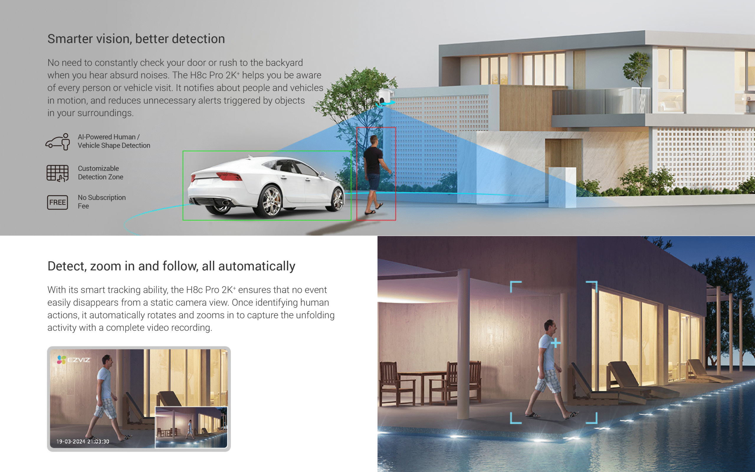 The H8c 2K⁺can be your ideal choice as a feature-rich outdoor camera to enhance home safety, especially for large-area monitoring. With its superior 2K⁺resolution and 360-degree field-of-view, it can easily watch over your backyard or garage entrance without blind spots. The camera further adds person detection and auto-zoom tracking to better capture important activities with smarter alerts.