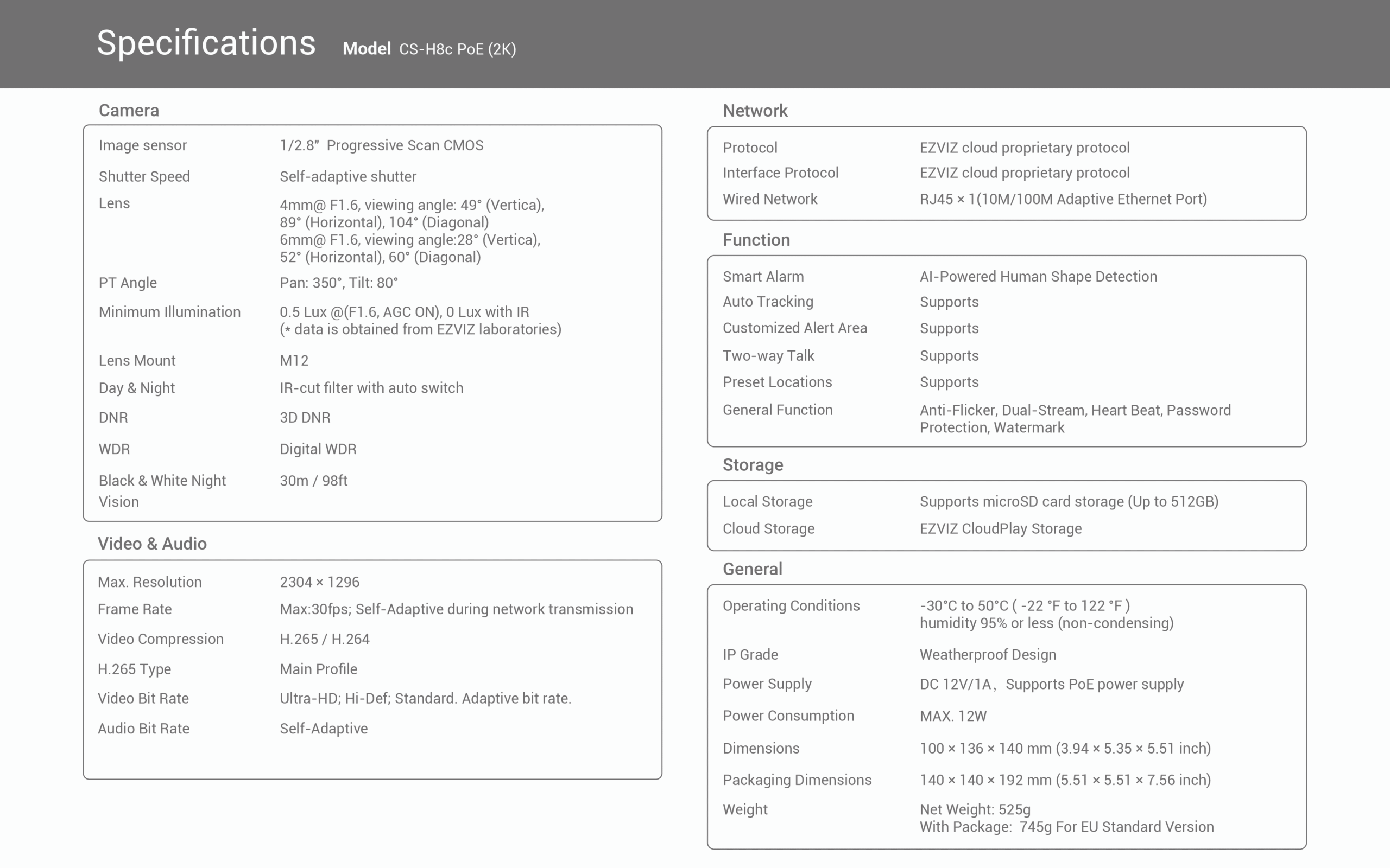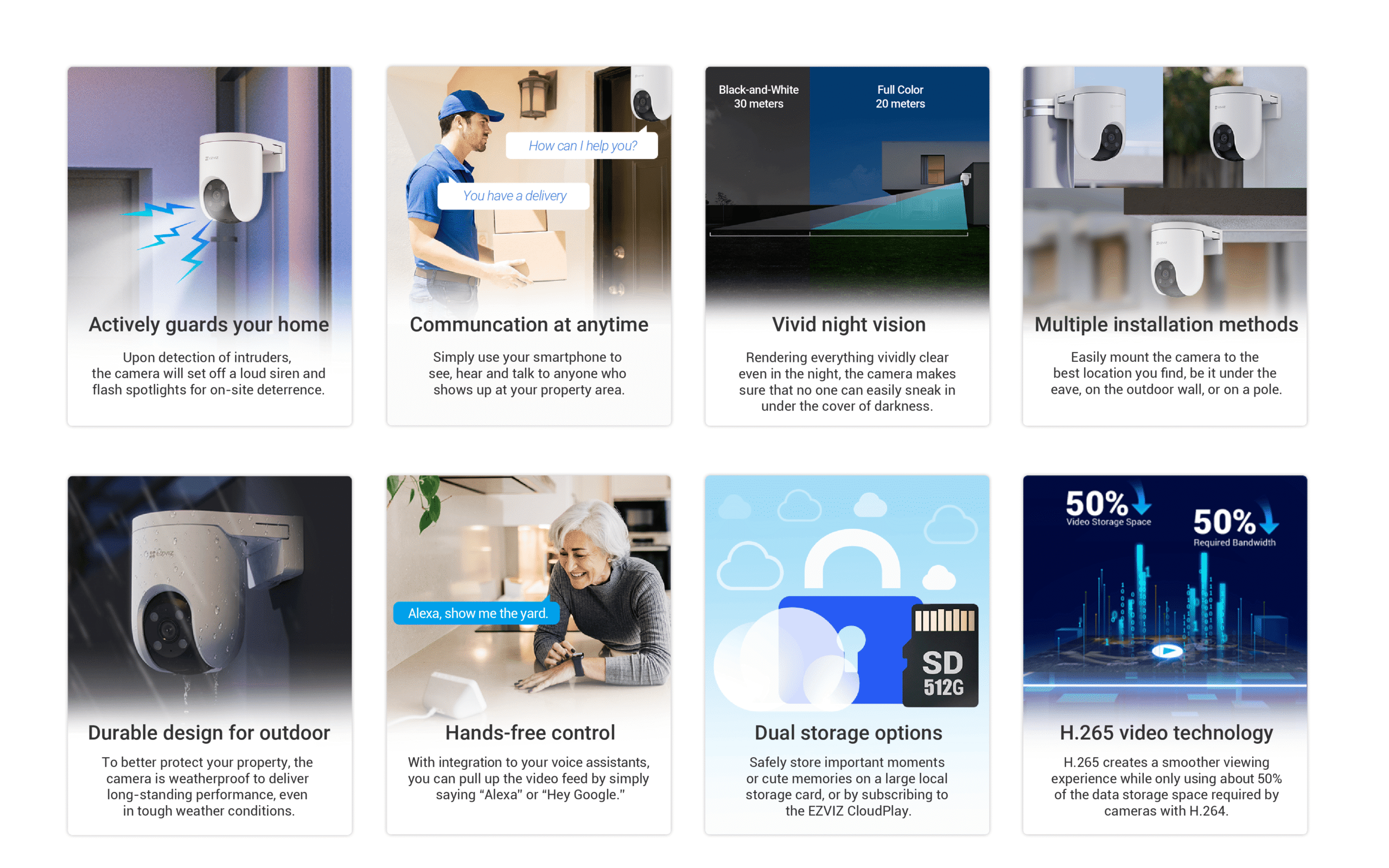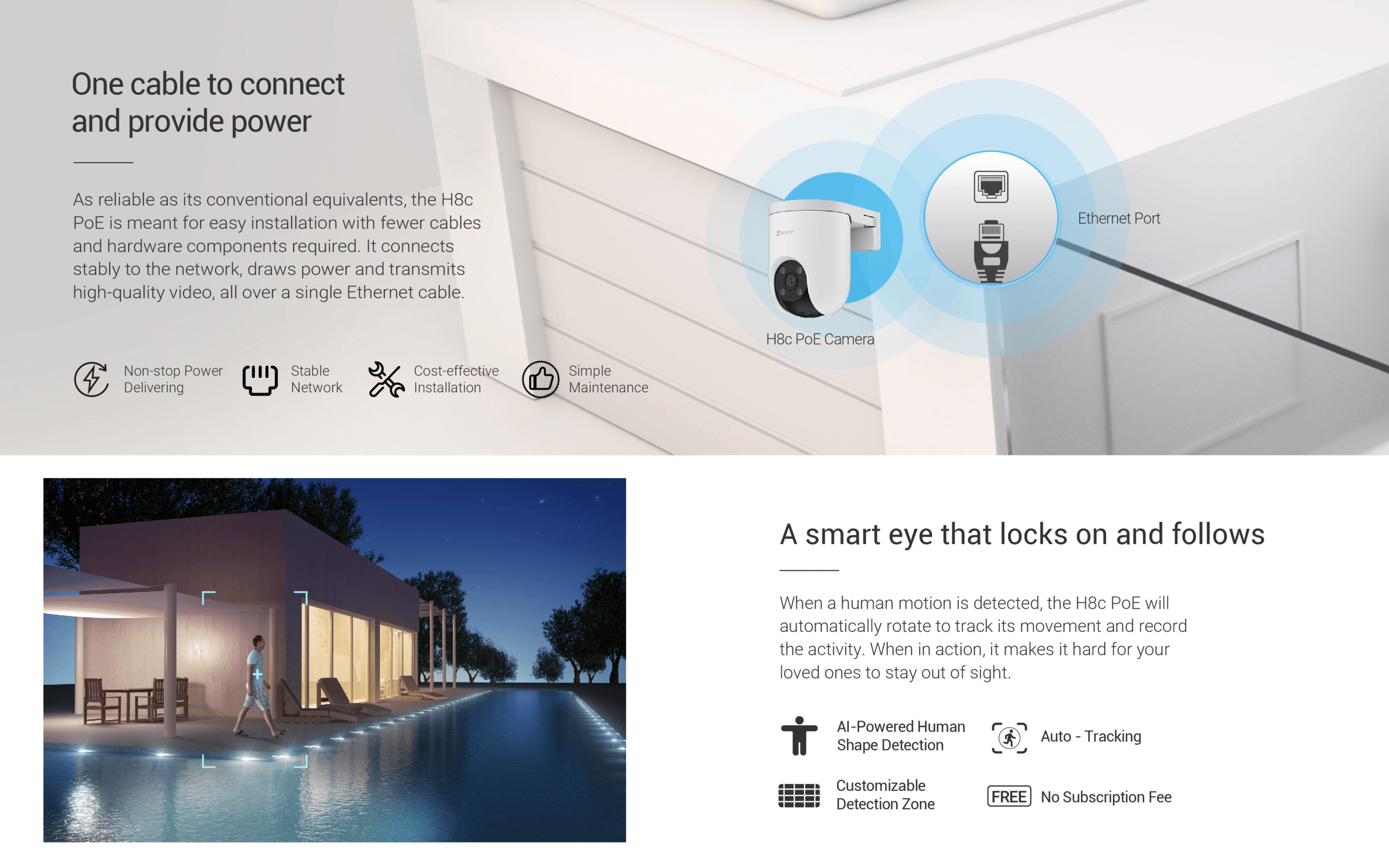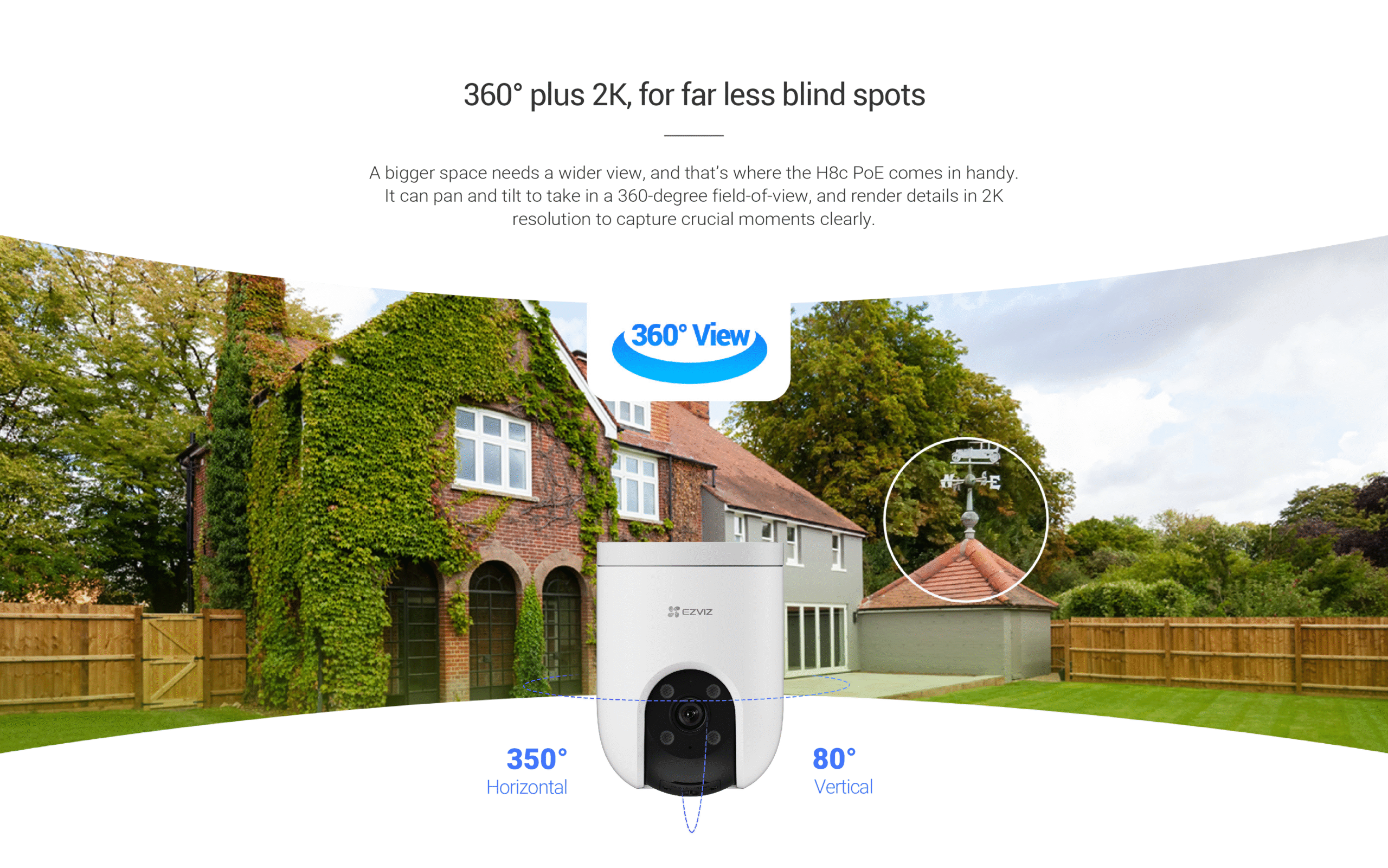 Inheriting the core technologies from EZVIZ’s award-winning outdoor pan & tilt camera series, the H8c puts loads of smart features into a compact unit for simply smart home protection. This trusted, accessible camera is reliable in any weather and operates steadily on residential internet platforms.