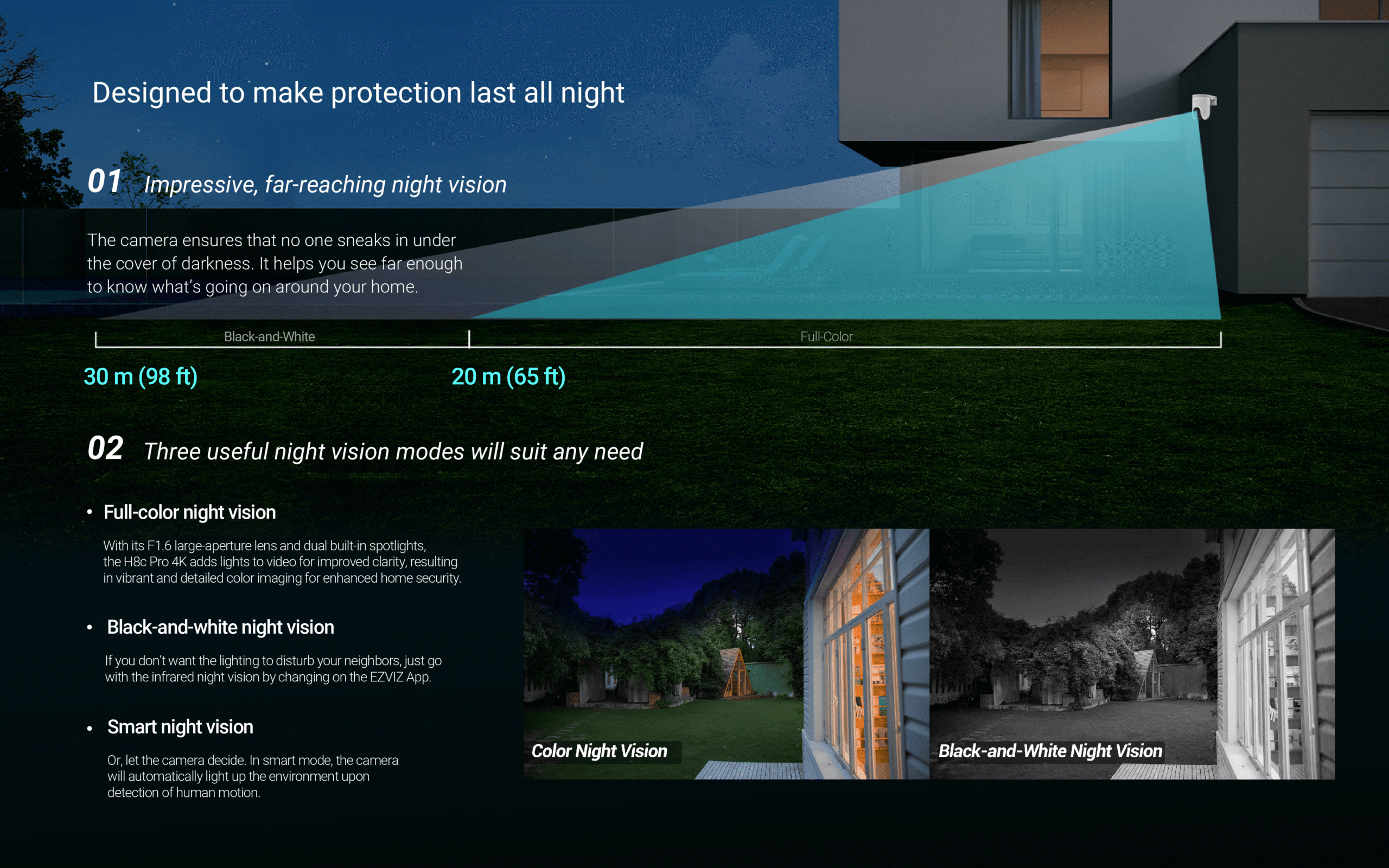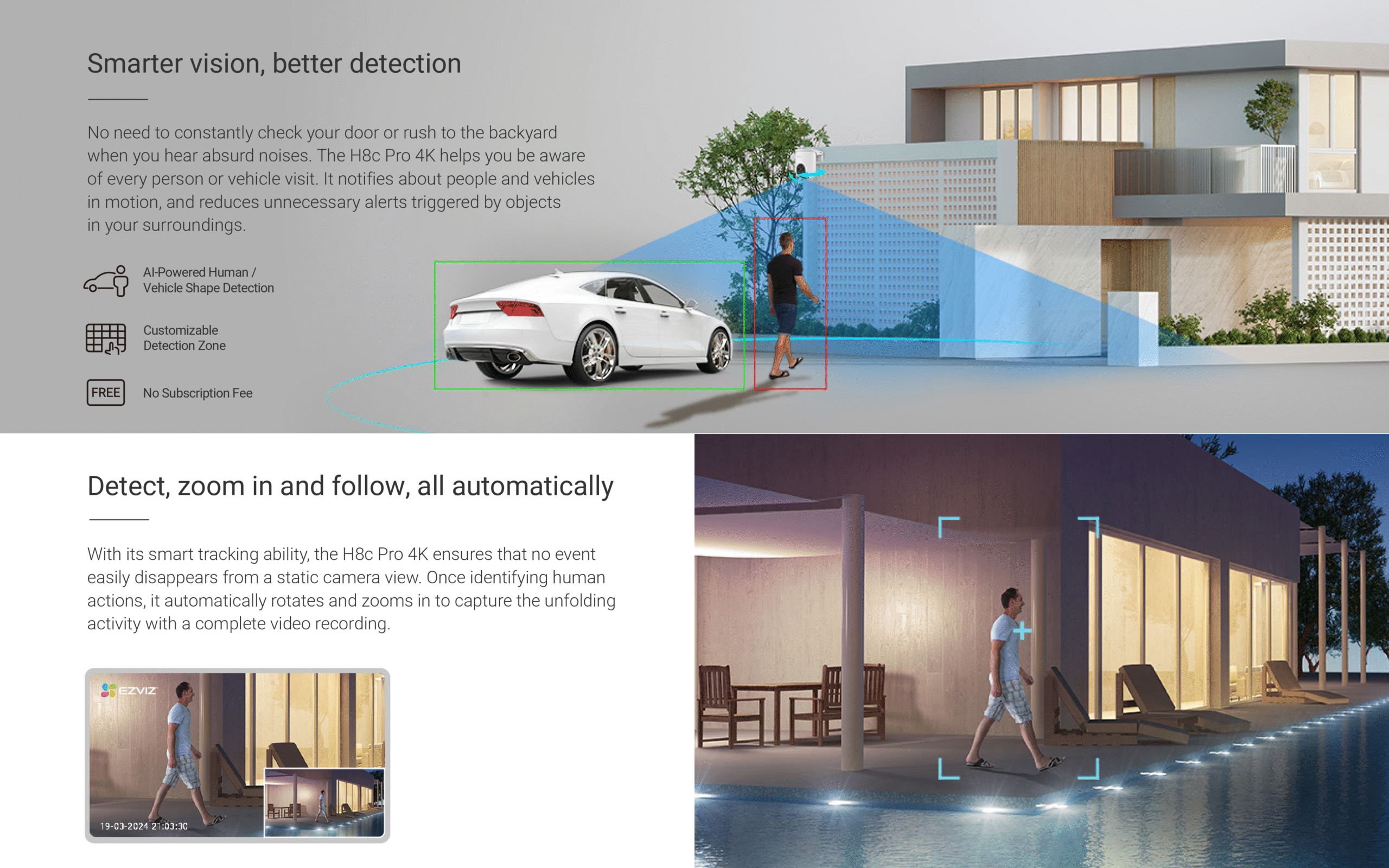 The H8c 4K⁺can be your ideal choice as a feature-rich outdoor camera to enhance home safety, especially for large-area monitoring. With its superior 4K⁺resolution and 360-degree field-of-view, it can easily watch over your backyard or garage entrance without blind spots. The camera further adds person detection and auto-zoom tracking to better capture important activities with smarter alerts.