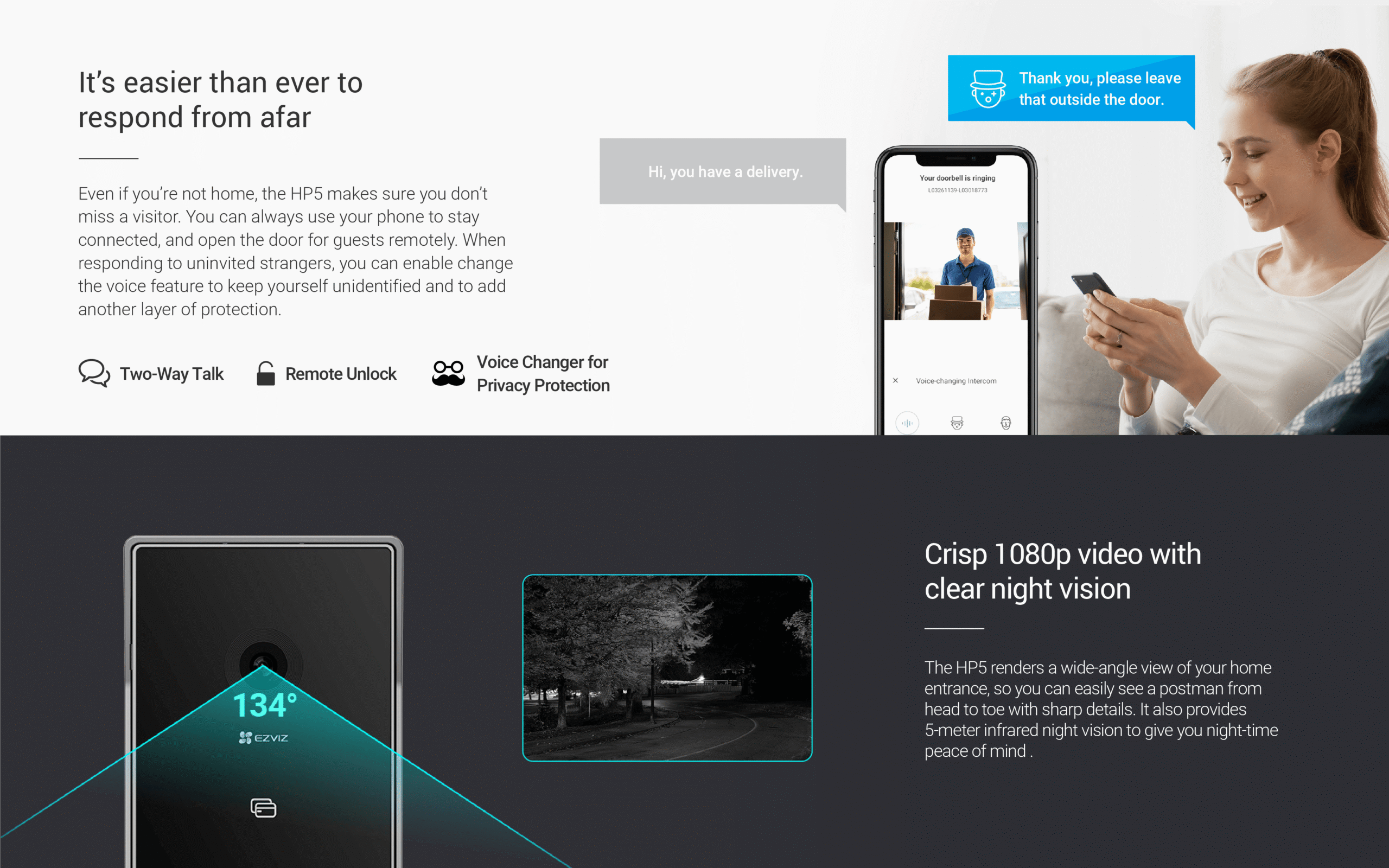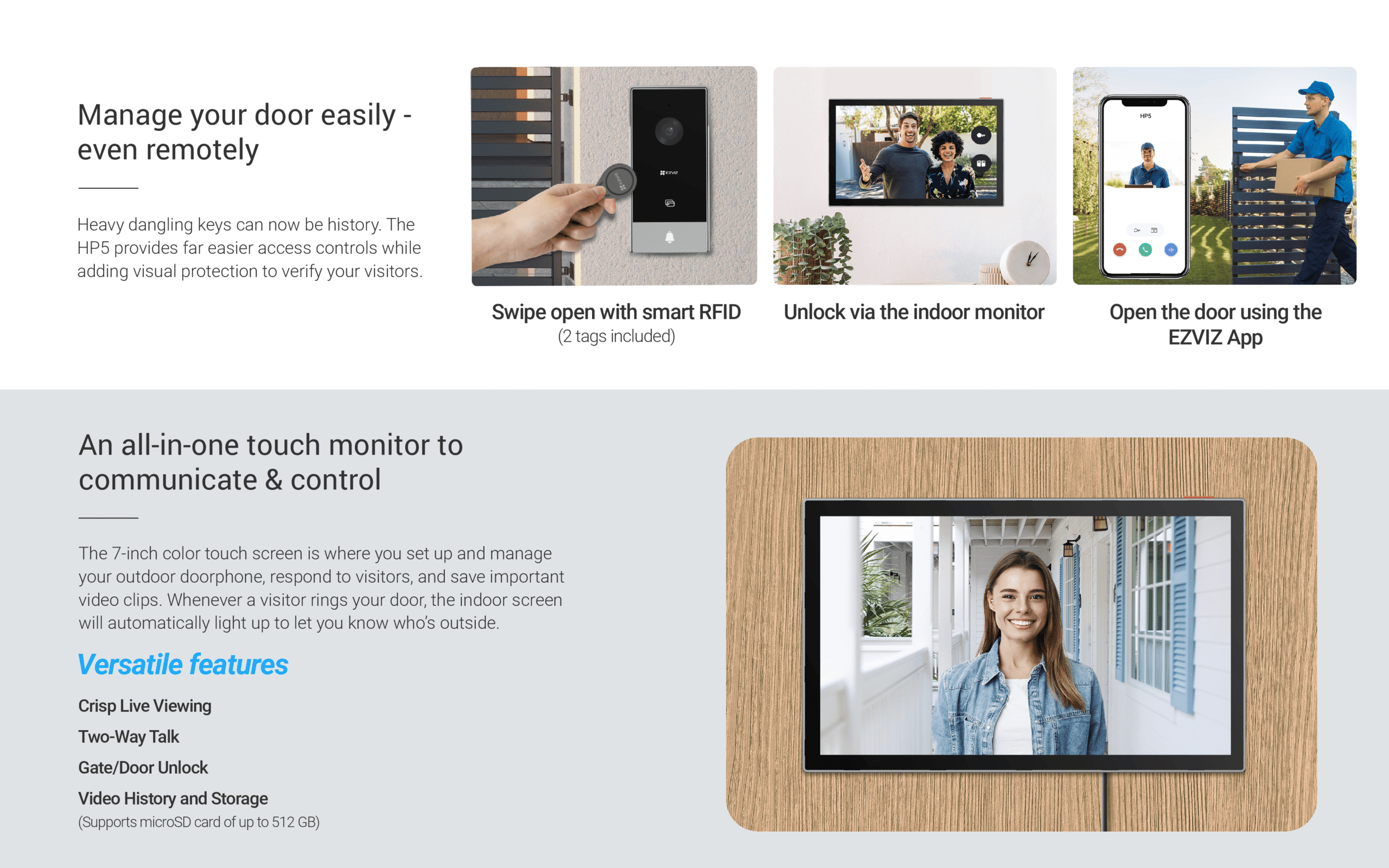 It’s time to upgrade your old intercom to be internet-connected, remotely accessible, and app-controllable. EZVIZ’s first-ever HP7 Video Doorphone maximizes the convenience for homeowners to view, talk, and grant access to visitors even if they’re not home. It also enhances home safety, as the 2-in-1 outdoor camera and phone helps record videos in 2K clarity and detect people with real-time mobile notifications.