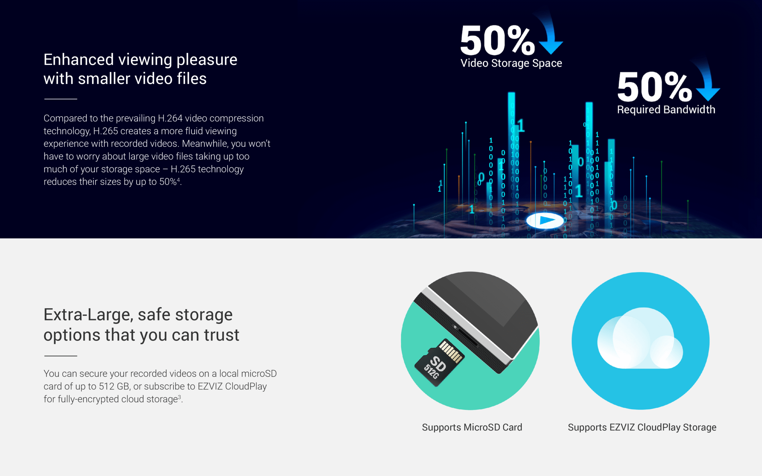 - Supports MicroSD Card (Up to 512 GB) & EZVIZ CloudPlay Storage